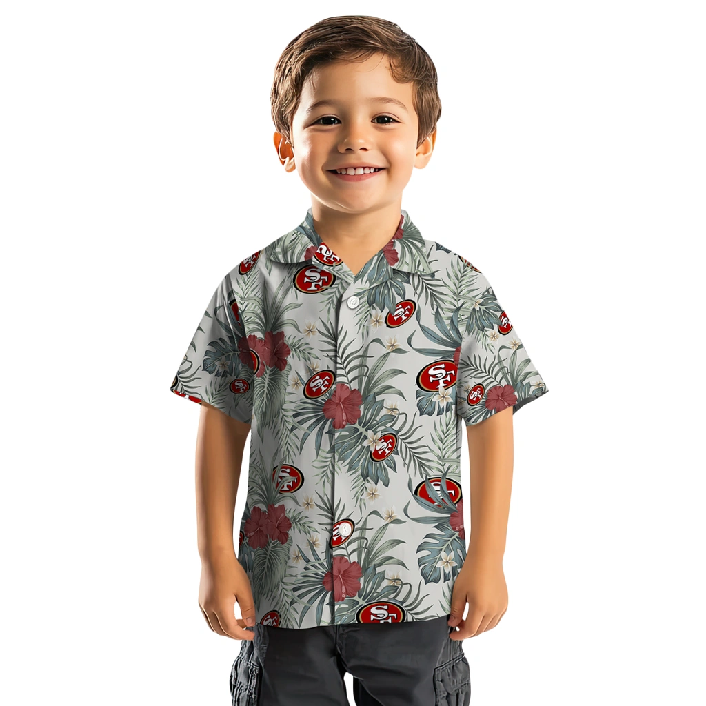 Show your San Francisco 49ers spirit in tropical style. Red hibiscus flowers scattered with monstera and palm leaves, accented with team logo. Available for men, women and kids. Great for matching looks.