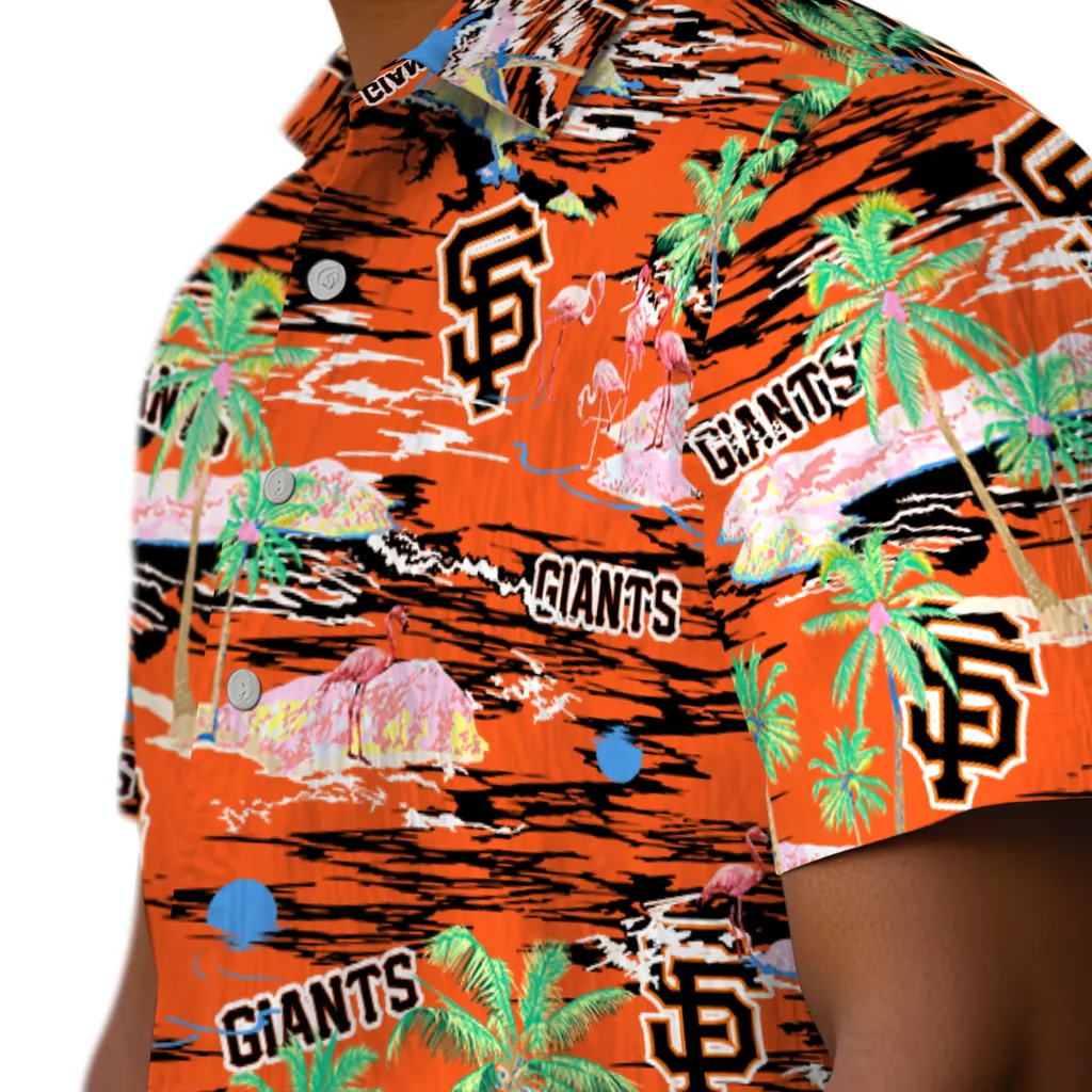 Show your San Francisco Giants spirit in tropical style. Beach island scenes with flamingos and team logo for a summer-ready Hawaiian shirt. Available for men, women and kids. Great for matching looks.