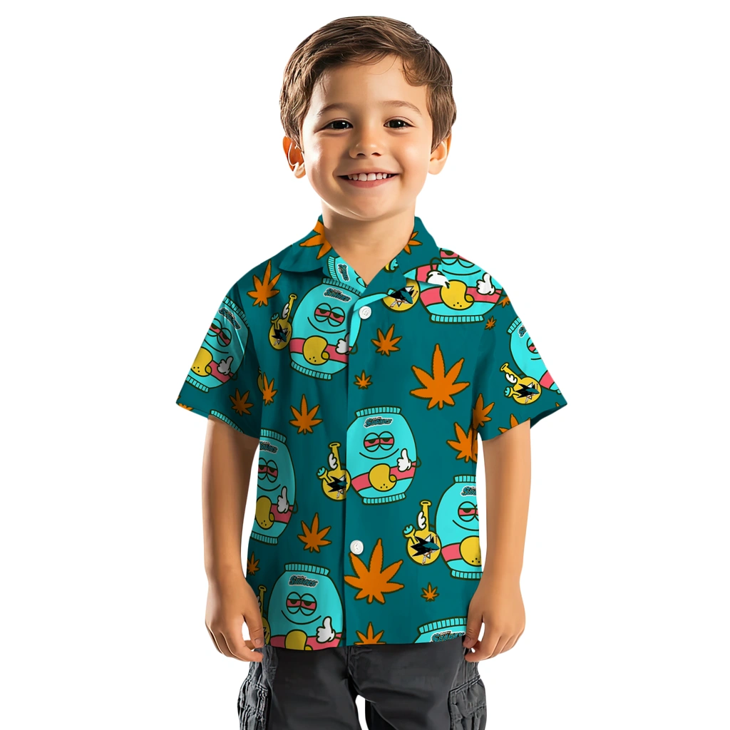 Show your San Jose Sharks spirit in tropical style. Colorful psychedelic motifs paired with team logo for a fun Hawaiian shirt. Available for men, women and kids. Great for matching looks.