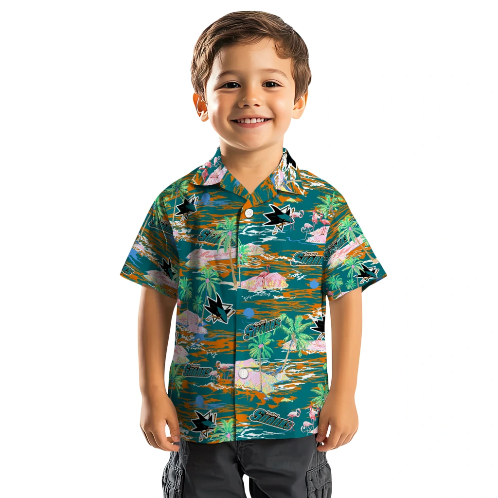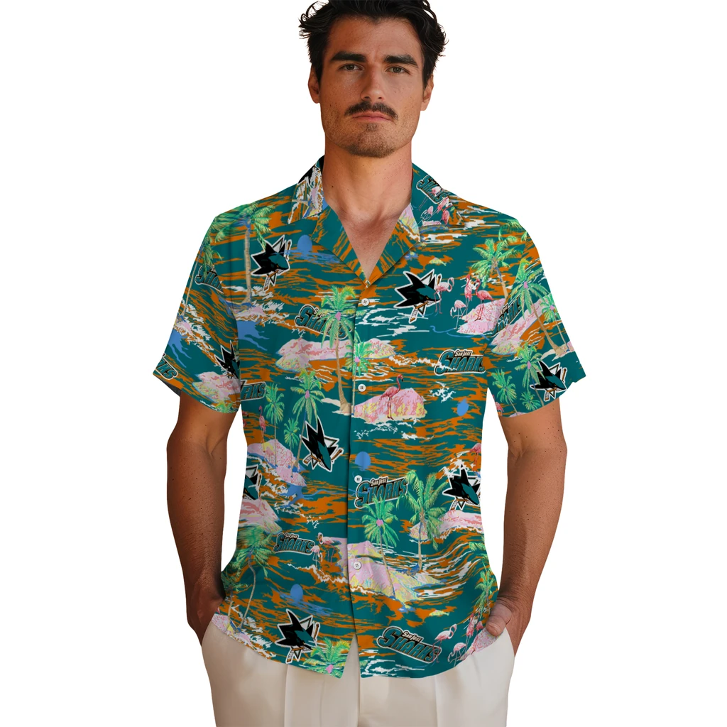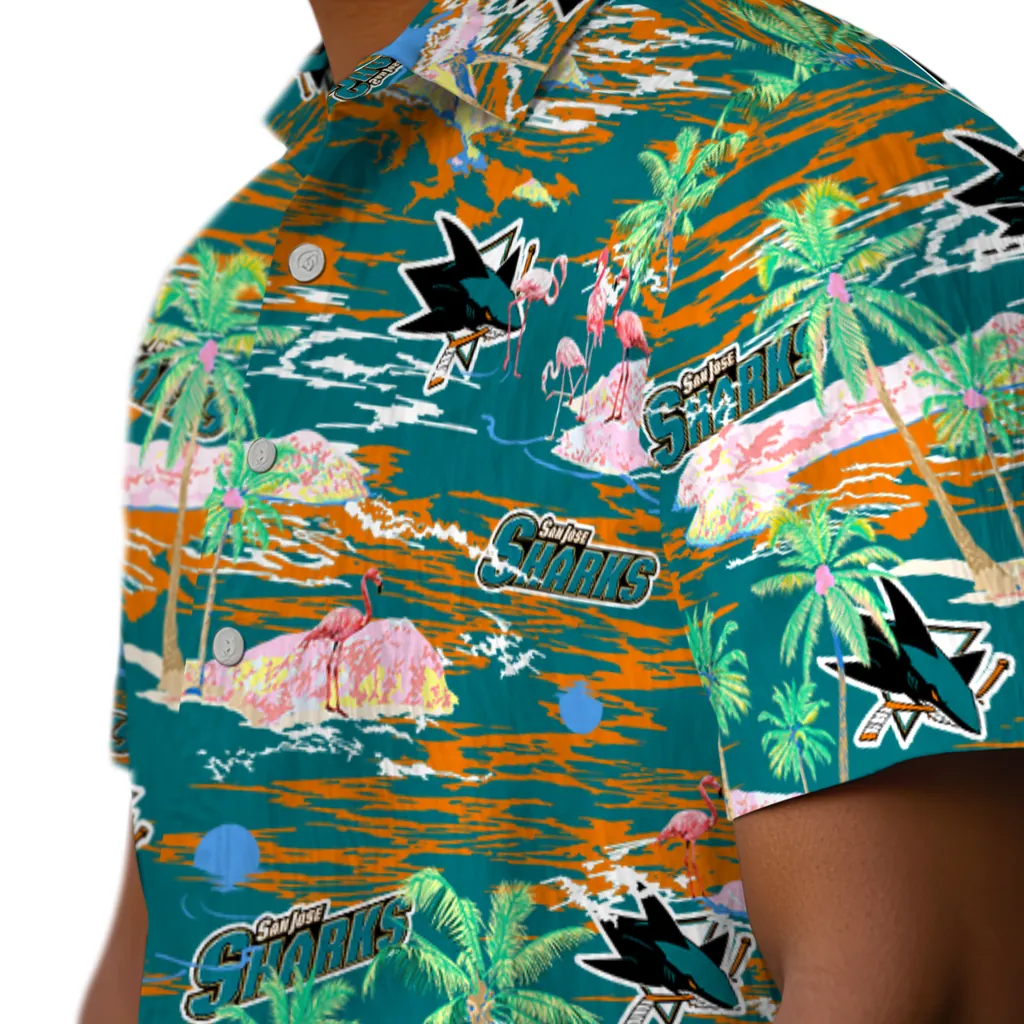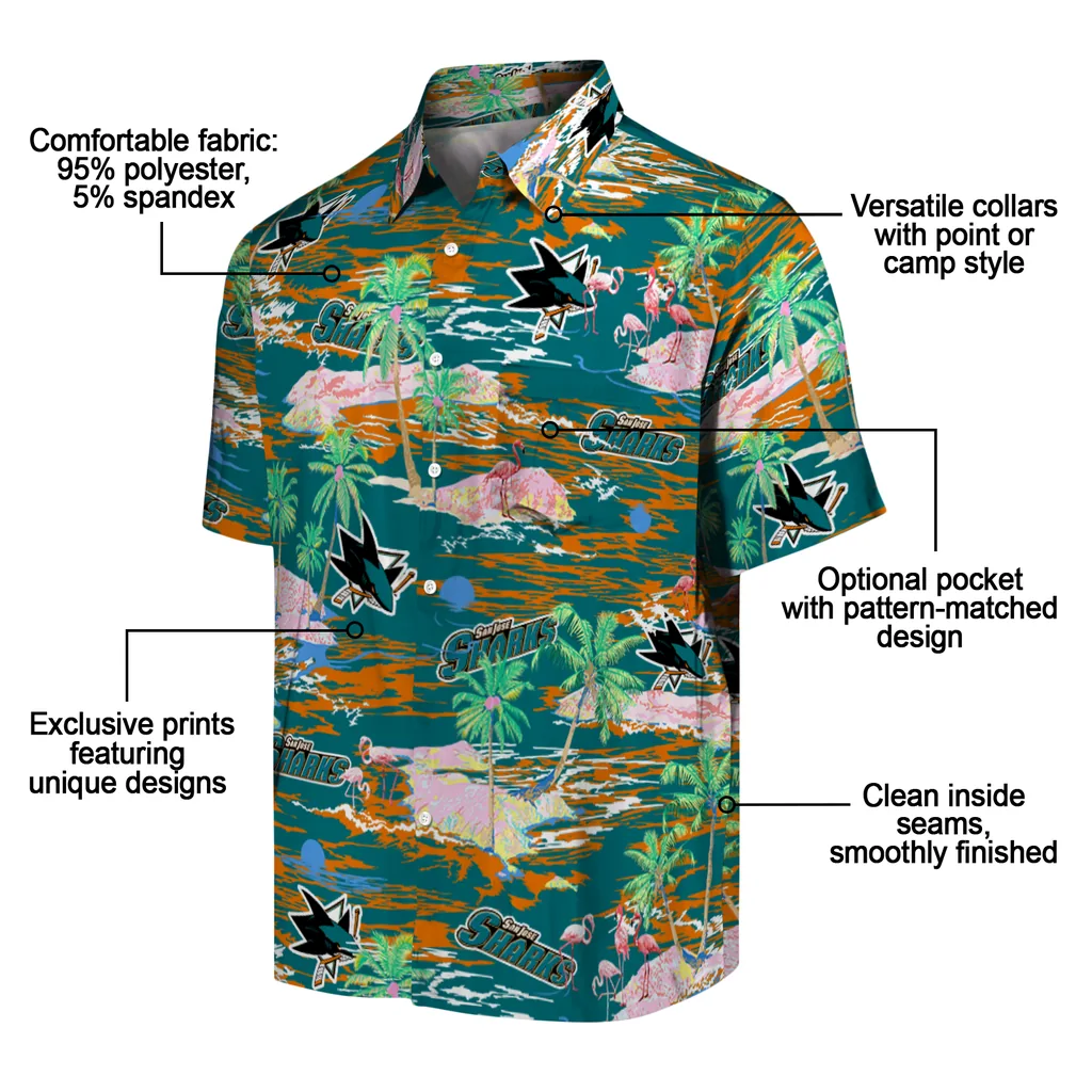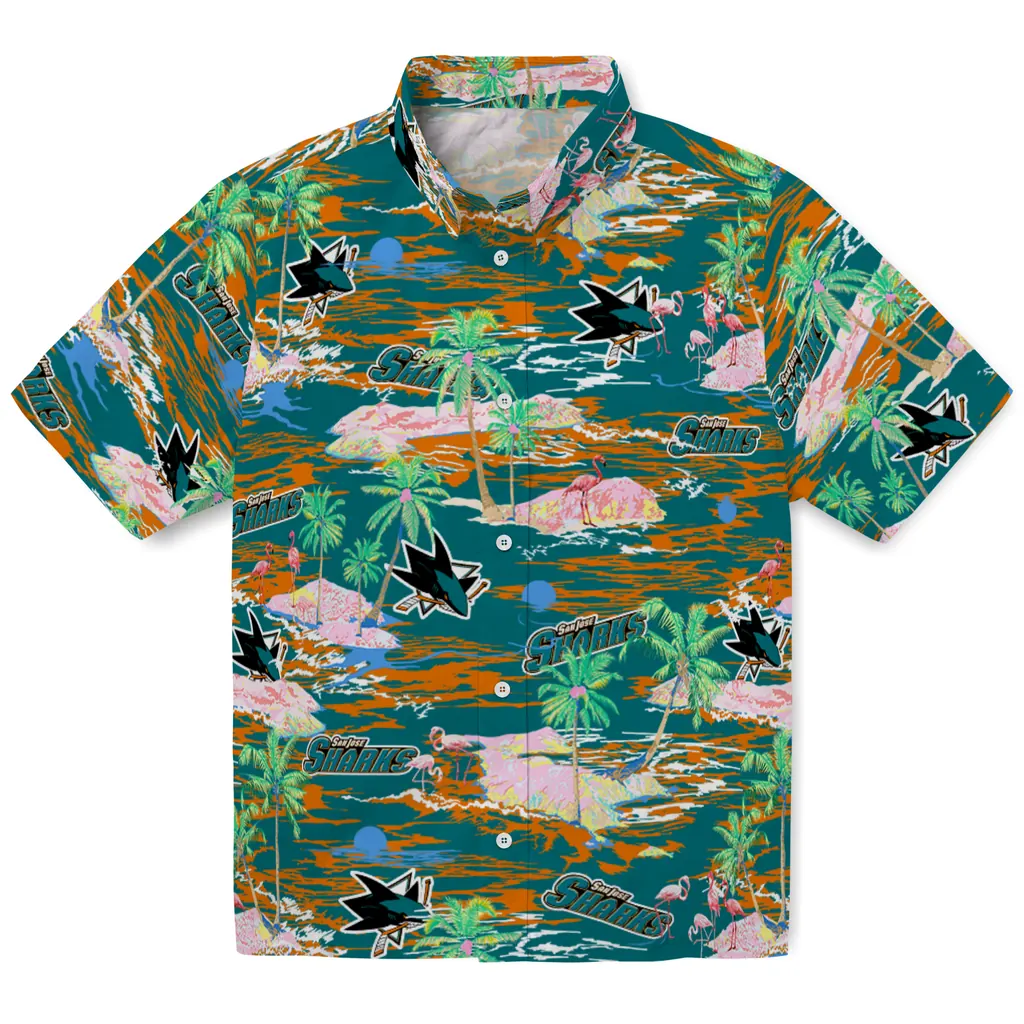 Show your San Jose Sharks spirit in tropical style. Beach island scenes with flamingos and team logo for a summer-ready Hawaiian shirt. Available for men, women and kids. Great for matching looks.