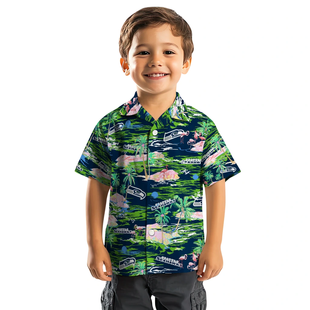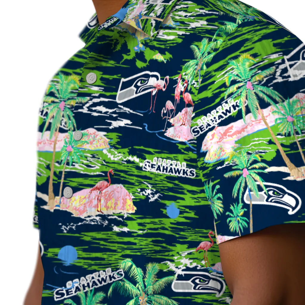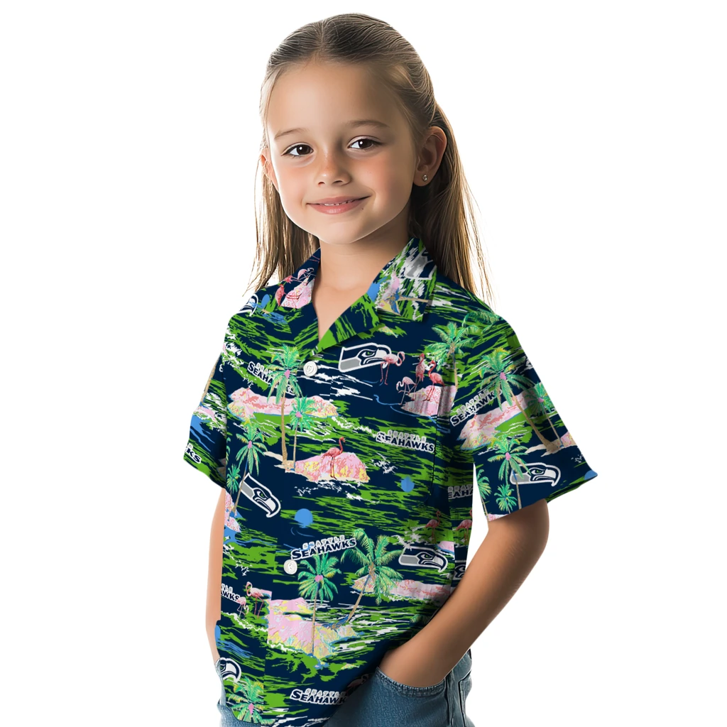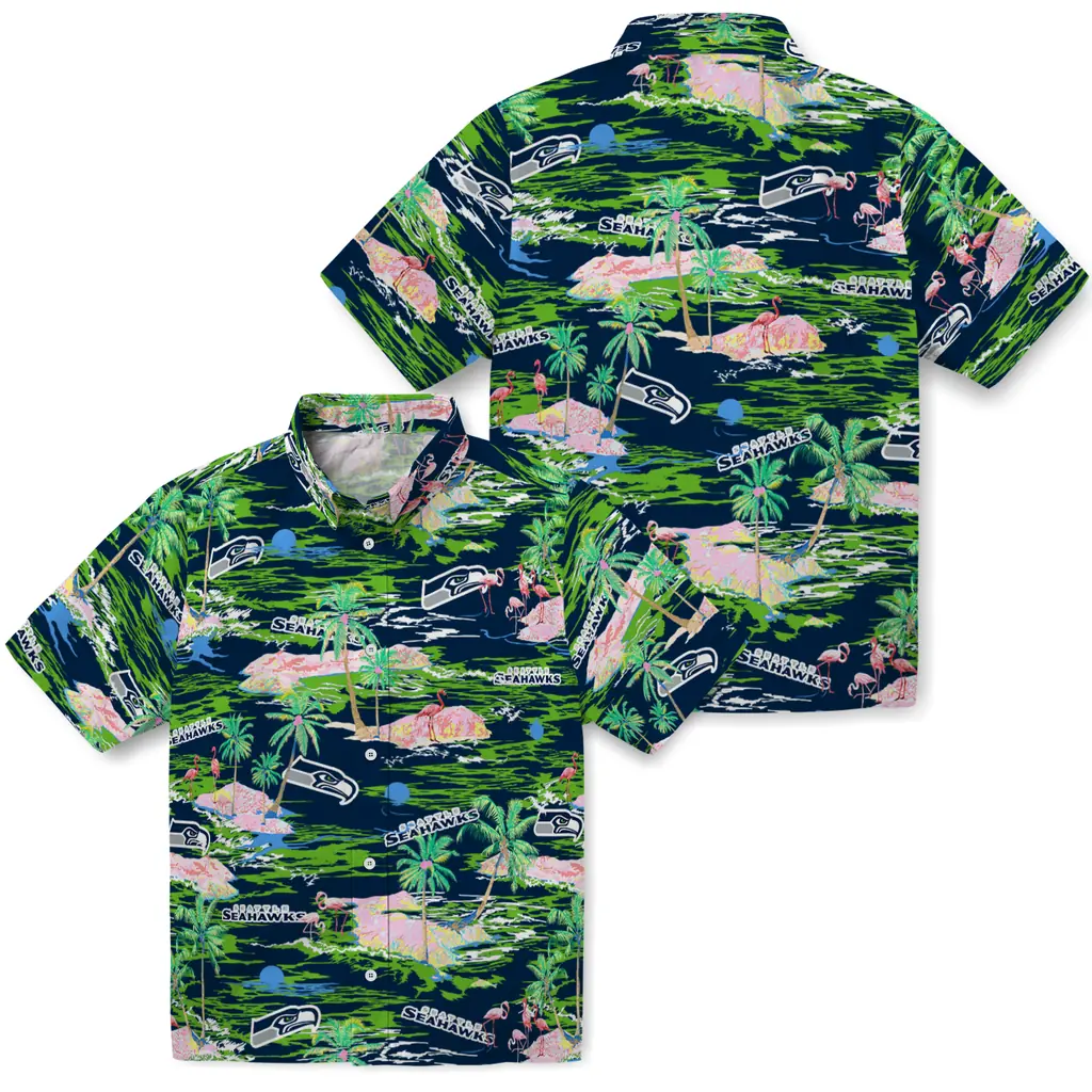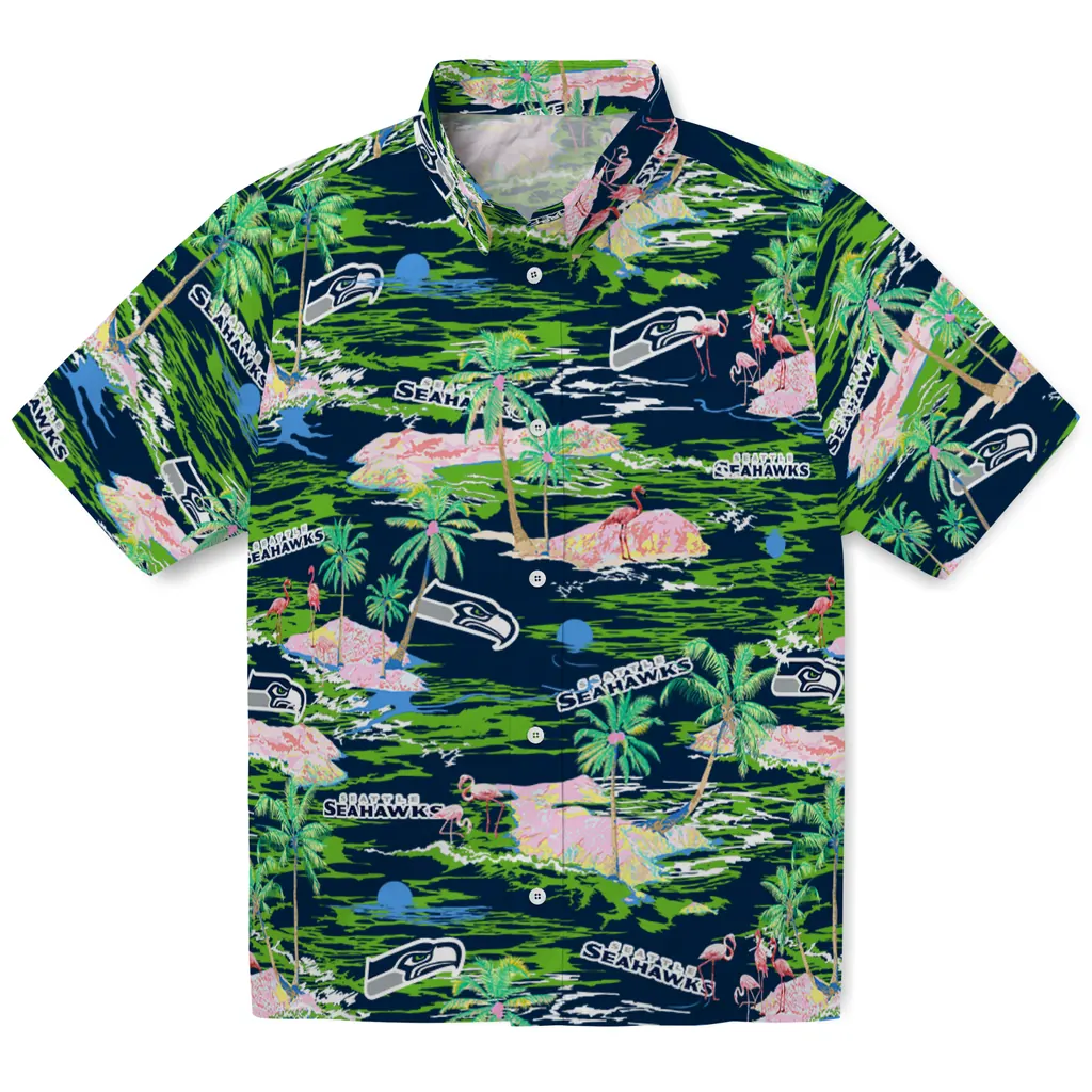 Show your Seattle Seahawks spirit in tropical style. Beach island scenes with flamingos and team logo for a summer-ready Hawaiian shirt. Available for men, women and kids. Great for matching looks.