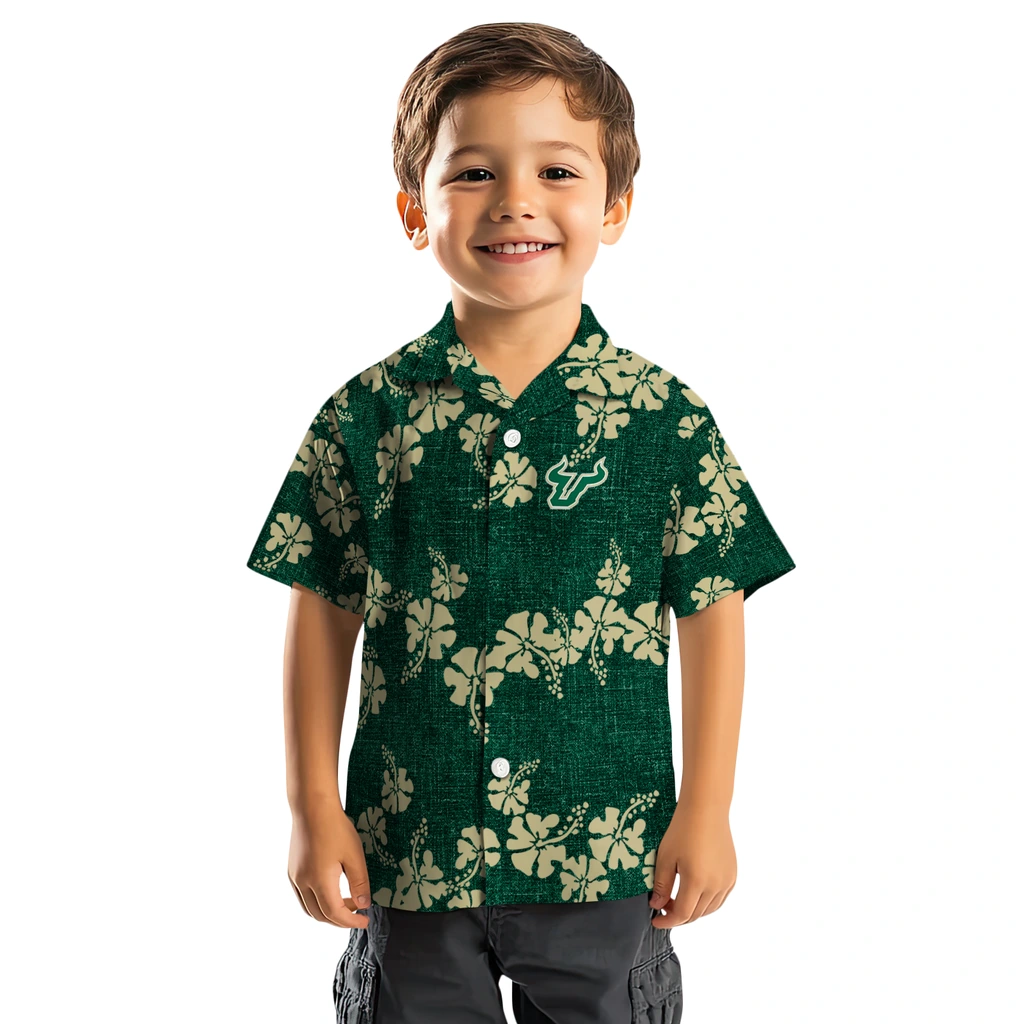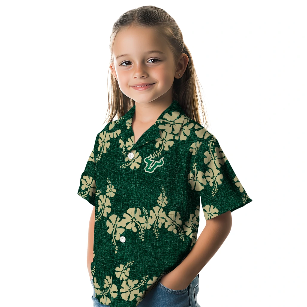 Show your South Florida Bulls spirit in tropical style. Dark hibiscus and tropical leaves highlighted with team logo for a bold tropical look. Available for men, women and kids. Great for matching looks.