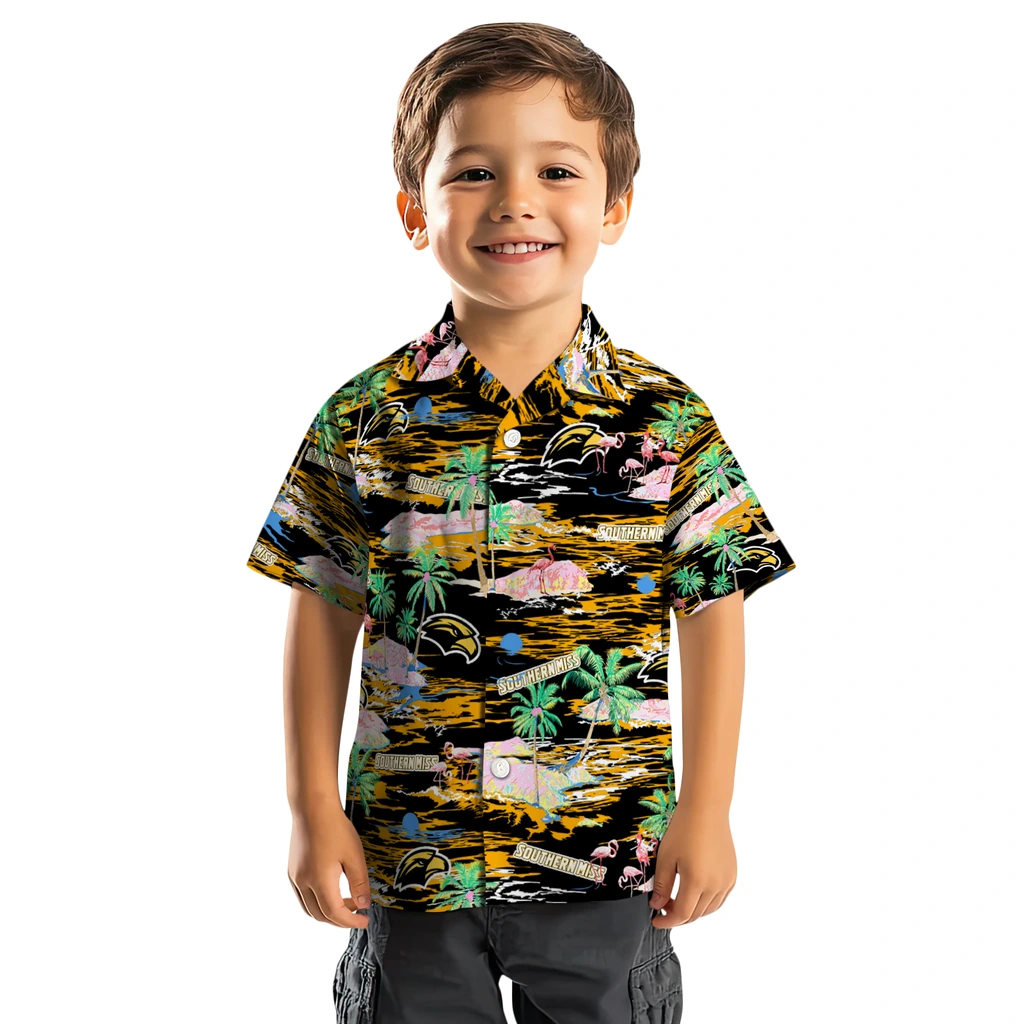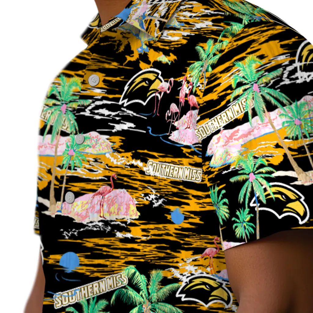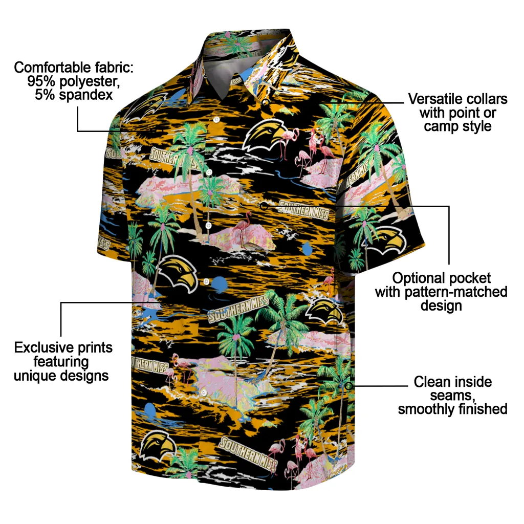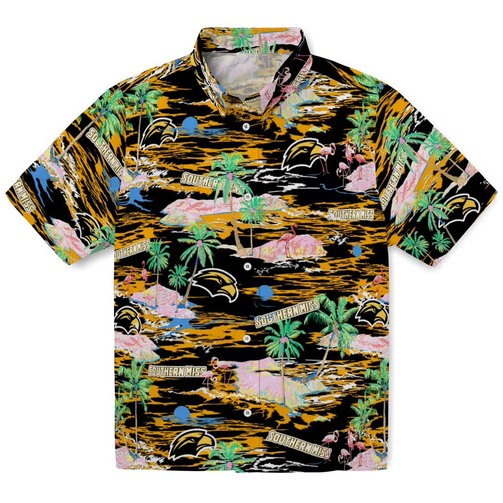 Show your Southern Miss Golden Eagles spirit in tropical style. Beach island scenes with flamingos and team logo for a summer-ready Hawaiian shirt. Available for men, women and kids. Great for matching looks.