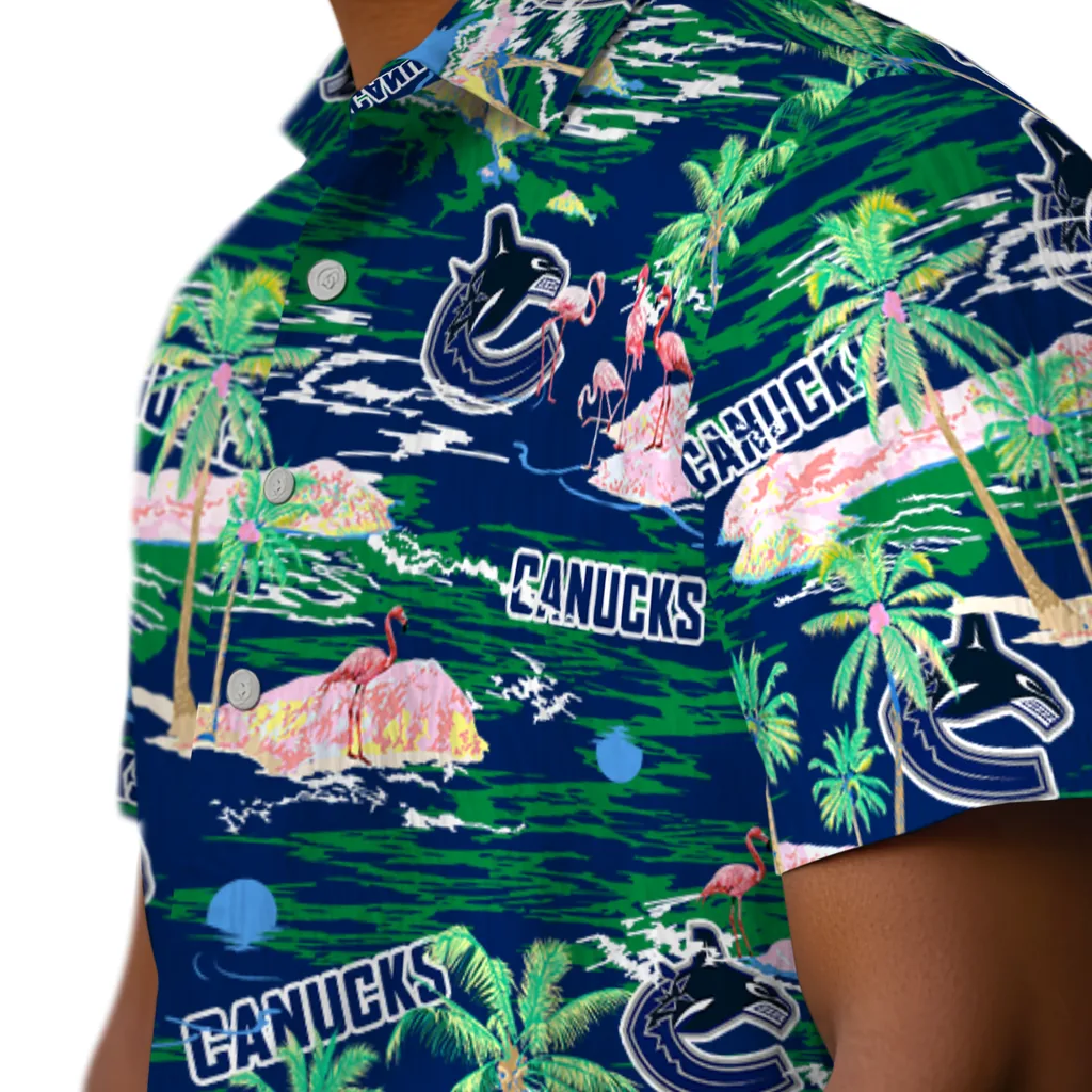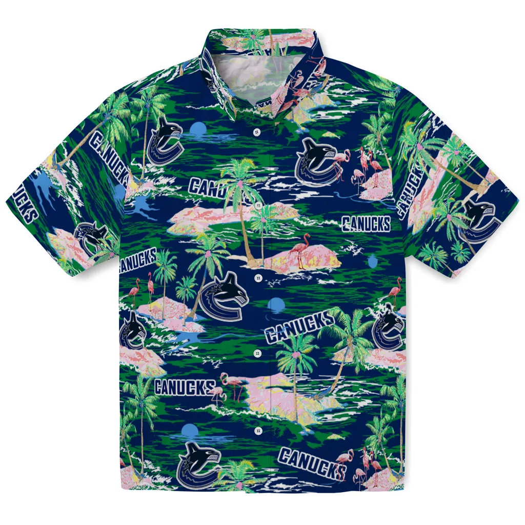 Show your Vancouver Canucks spirit in tropical style. Beach island scenes with flamingos and team logo for a summer-ready Hawaiian shirt. Available for men, women and kids. Great for matching looks.