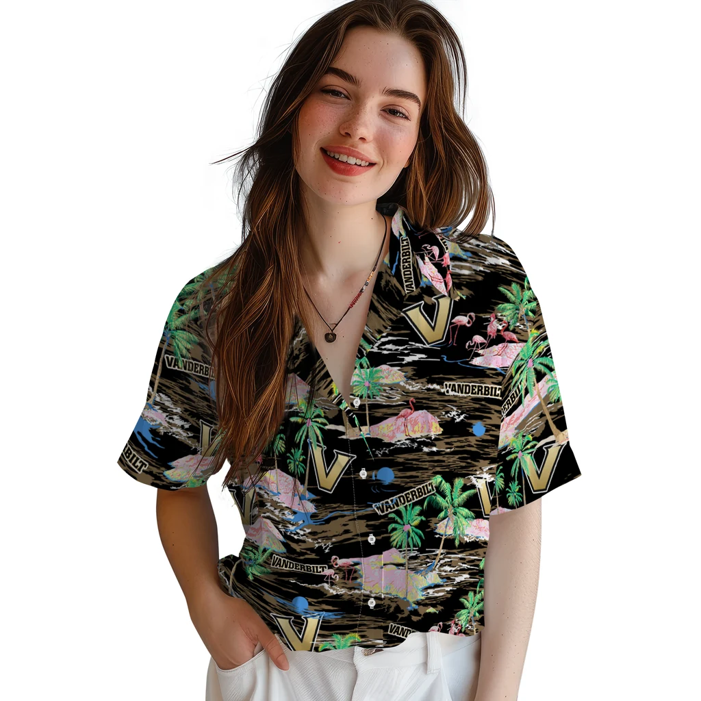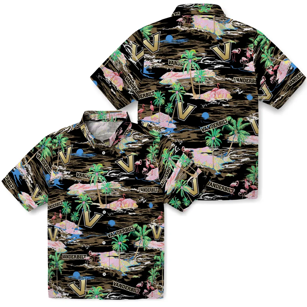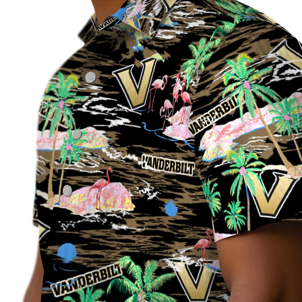 Show your Vanderbilt Commodores spirit in tropical style. Beach island scenes with flamingos and team logo for a summer-ready Hawaiian shirt. Available for men, women and kids. Great for matching looks.