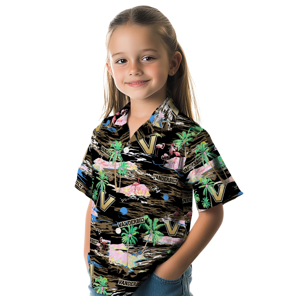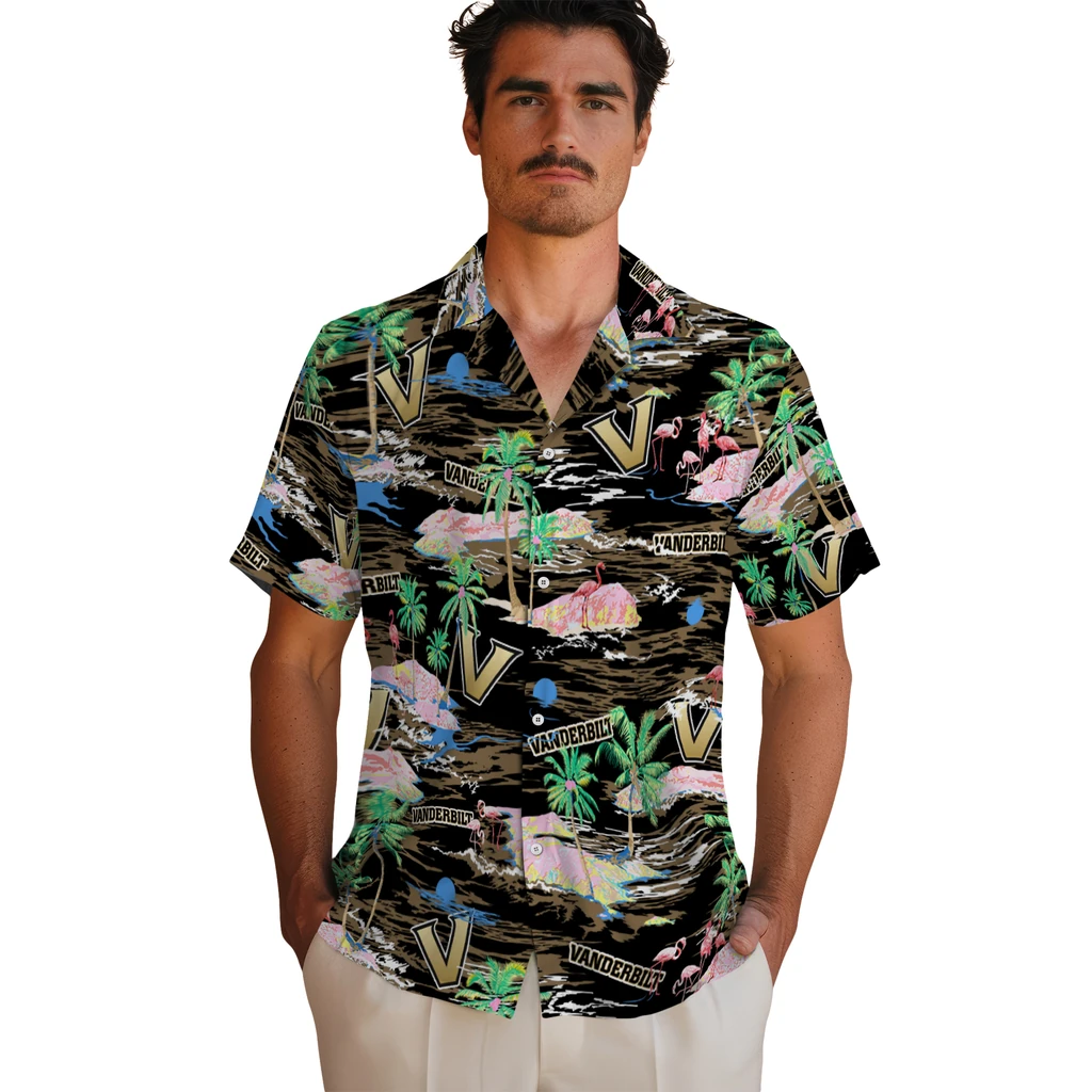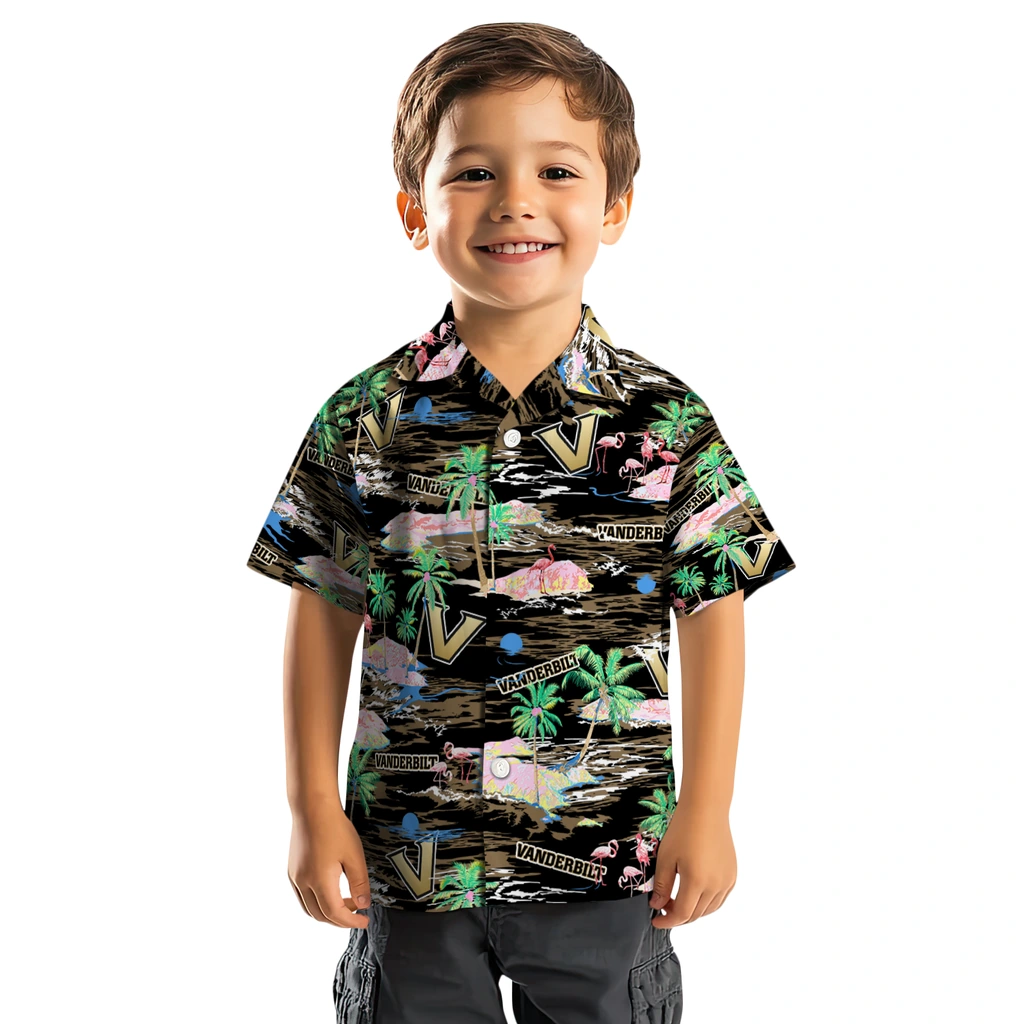 Show your Vanderbilt Commodores spirit in tropical style. Beach island scenes with flamingos and team logo for a summer-ready Hawaiian shirt. Available for men, women and kids. Great for matching looks.