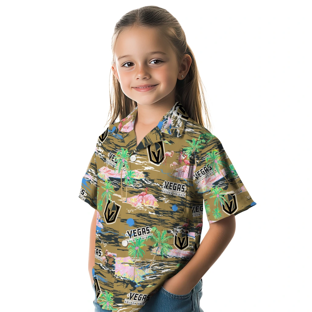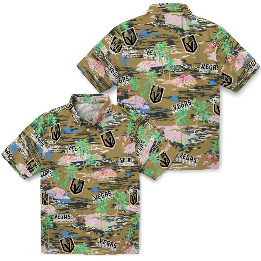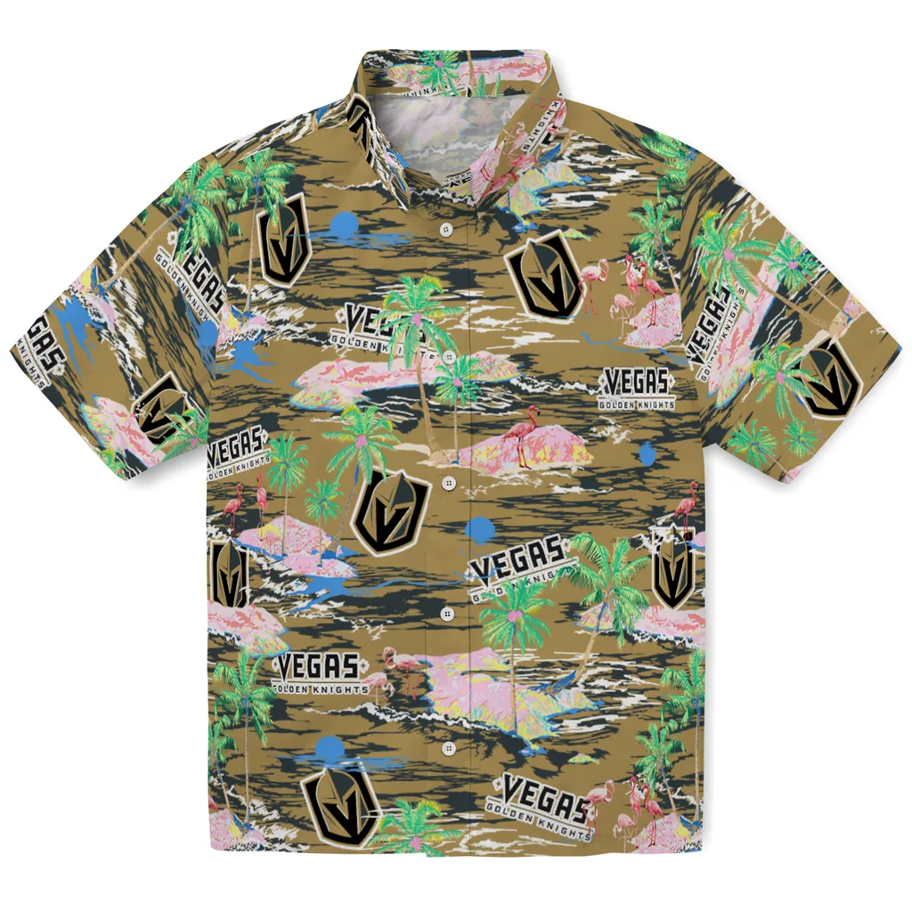 Show your Vegas Golden Knights spirit in tropical style. Beach island scenes with flamingos and team logo for a summer-ready Hawaiian shirt. Available for men, women and kids. Great for matching looks.