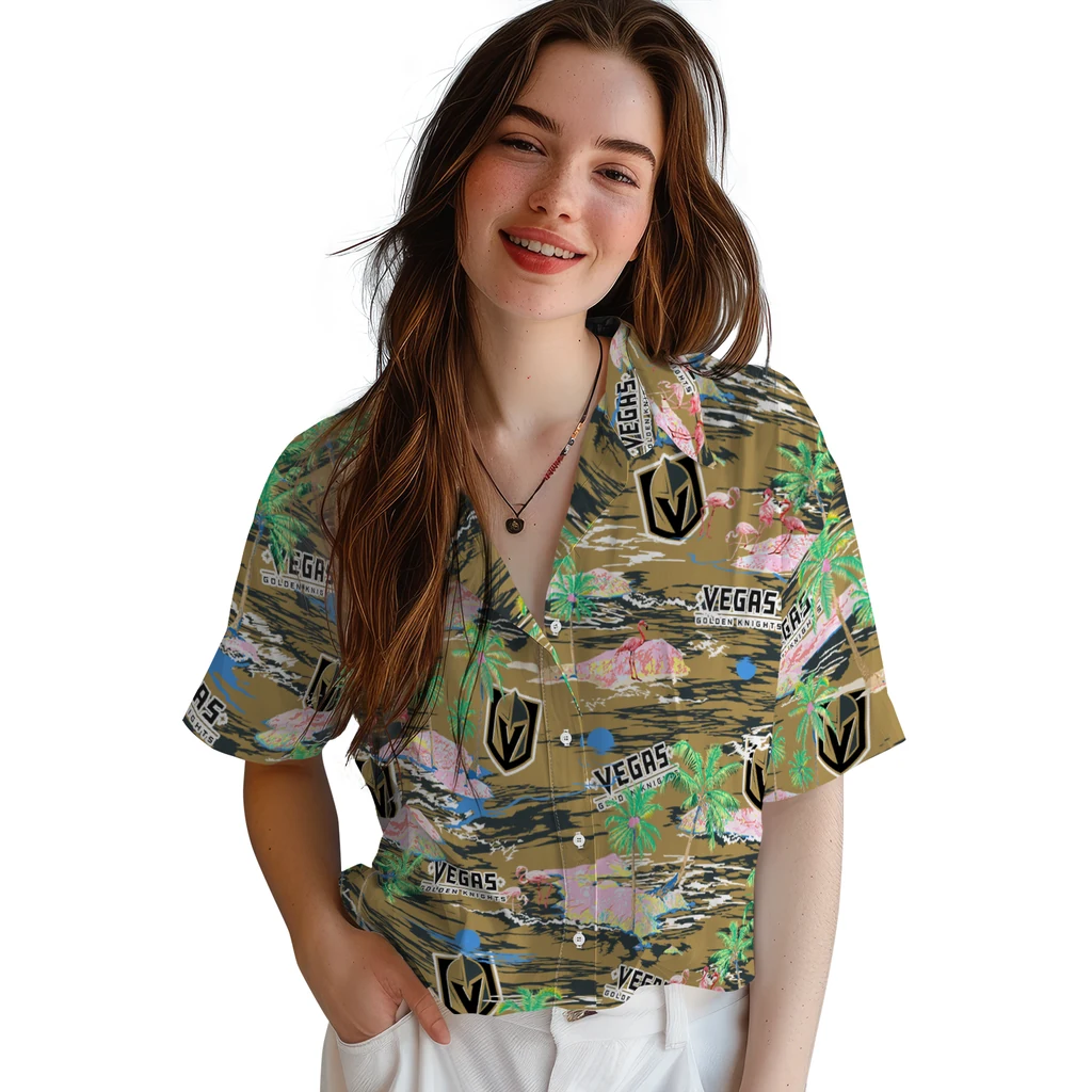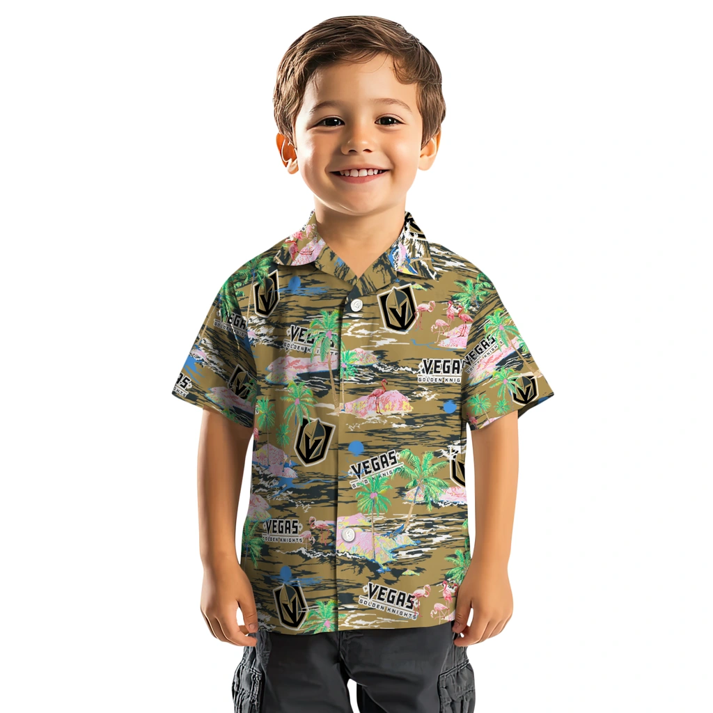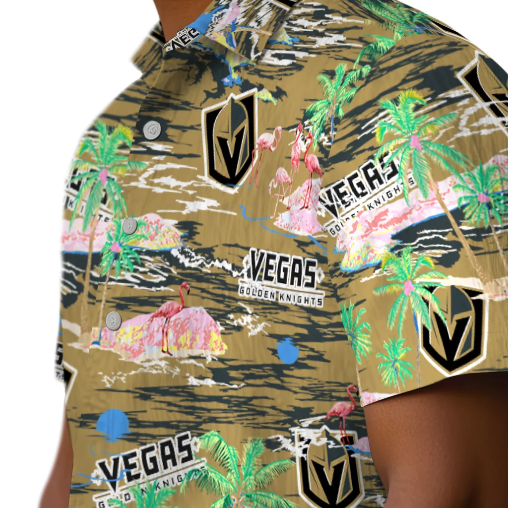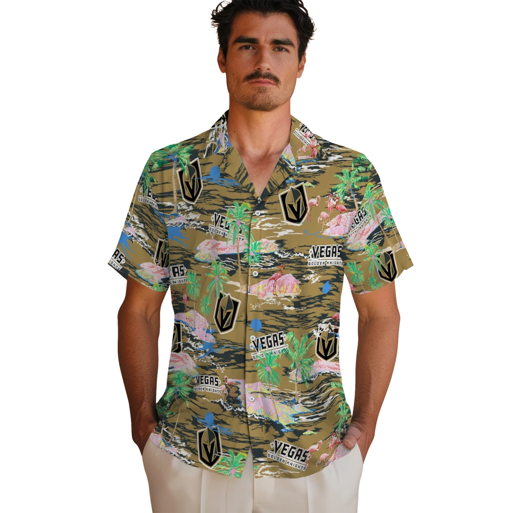 Show your Vegas Golden Knights spirit in tropical style. Beach island scenes with flamingos and team logo for a summer-ready Hawaiian shirt. Available for men, women and kids. Great for matching looks.