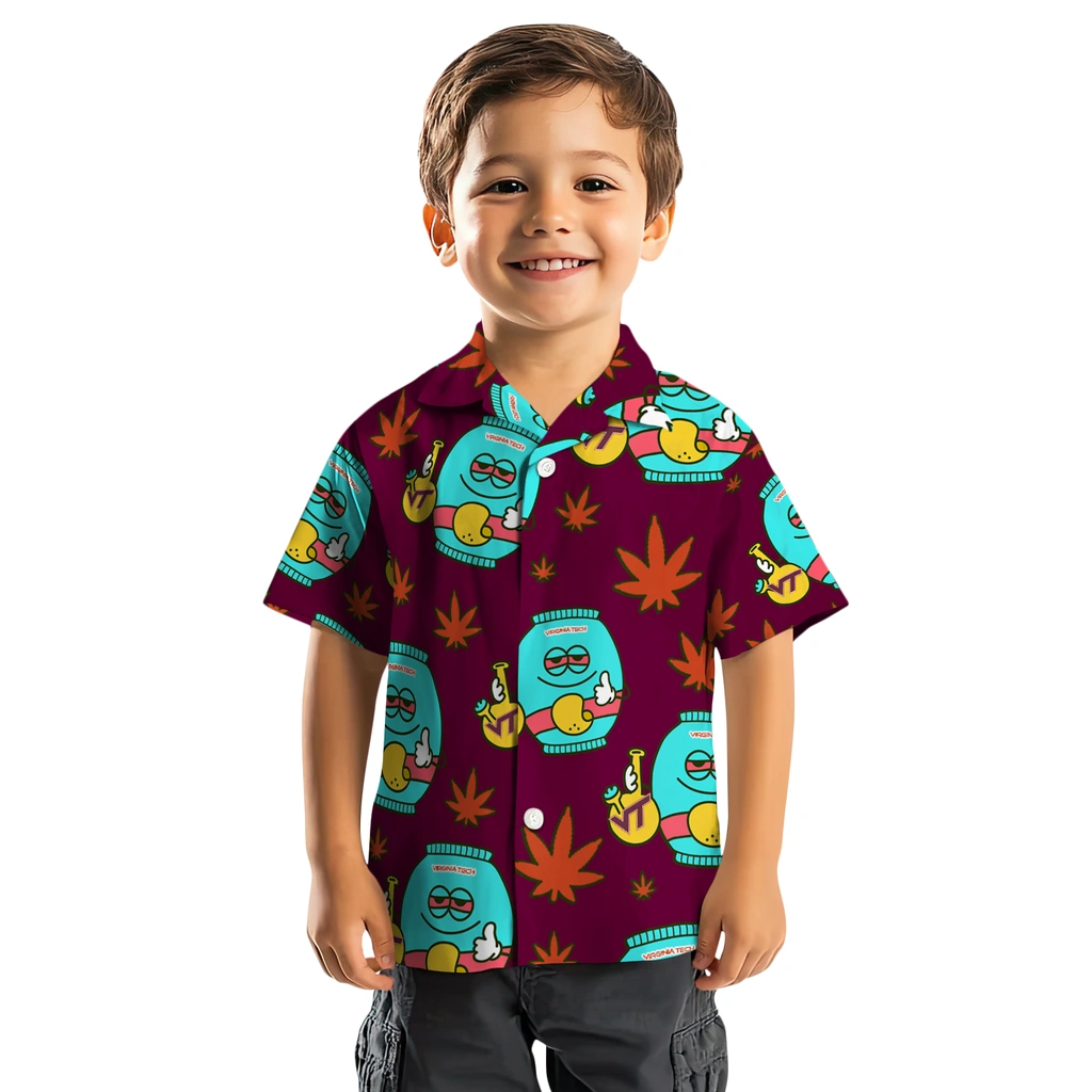Show your Virginia Tech Hokies spirit in tropical style. Colorful psychedelic motifs paired with team logo for a fun Hawaiian shirt. Available for men, women and kids. Great for matching looks.